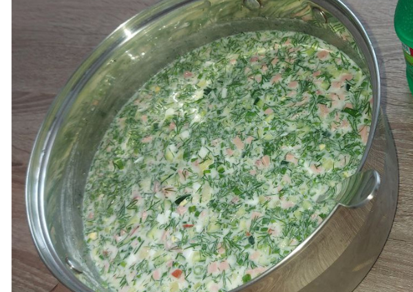 Уплітати за обидві щоки мені належало картоплю в кропі, окрошку з червоним квасом, який я терпіти не можу і нарізане шматками сало.